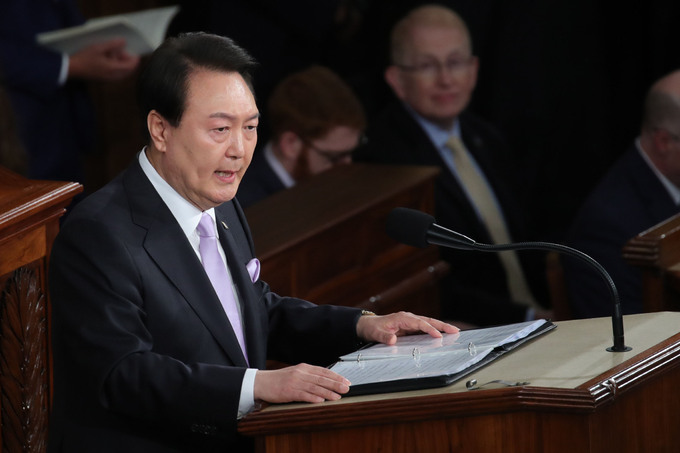 윤 대통령은 국빈 방미 나흘째인 이날 ‘자유의 동맹, 행동하는 동맹’(Aliiance of Freedom, Alliance in Action)이라는 제목의 연설을 40여분 동안 영어로 진행했다. 한국 대통령이 미 의회 연단에 오른 것은 2013년 5월 박근혜 전 대통령 이후 10년 만이다.