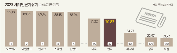 국경없는기자회(RSF)는 3일 ‘2023 세계 언론 자유 지수’에서 한국이 전체 180개국 중 47위(70.83점)를 기록, 지난해보다 4계단 하락했다고 밝혔다. RSF는 “한국의 언론사들은 정치인과 정부 관료·대기업의 압력에 직면해 있다”며 “회사 수익은 광고에 크게 의존하고 있고, 광고는 신문 편집에 영향을 미칠 수 있다”고 지적했다. 이어 “한국 언론인들은 온라인 괴롭힘의 피해자가 되기도 하는데 이에 대한 보호가 거의 이루어지지 않고 있다”고 했다.