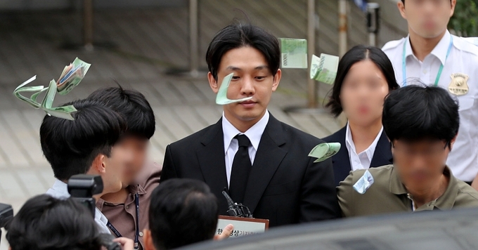 마약 투약 혐의를 받는 배우 유아인(37·본명 엄홍식)이 영장실질심사를 마치고 나오다 한 시민이 던진 돈다발에 맞는 해프닝이 발생했다.