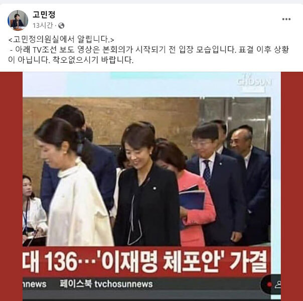 앞서 21일 밤 TV조선은 '이재명 체포안 가결' 소식을 전하면서 배경 화면으로 미소를 띈 고민정 최고의 모습이 포착 됐다.