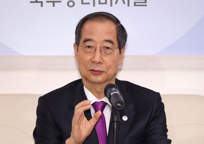 한덕수 국무총리가 18일 오후 세종시 정부세종청사에서 열린 출입기자단 간담회에서 발언하고 있다. 연합뉴스
