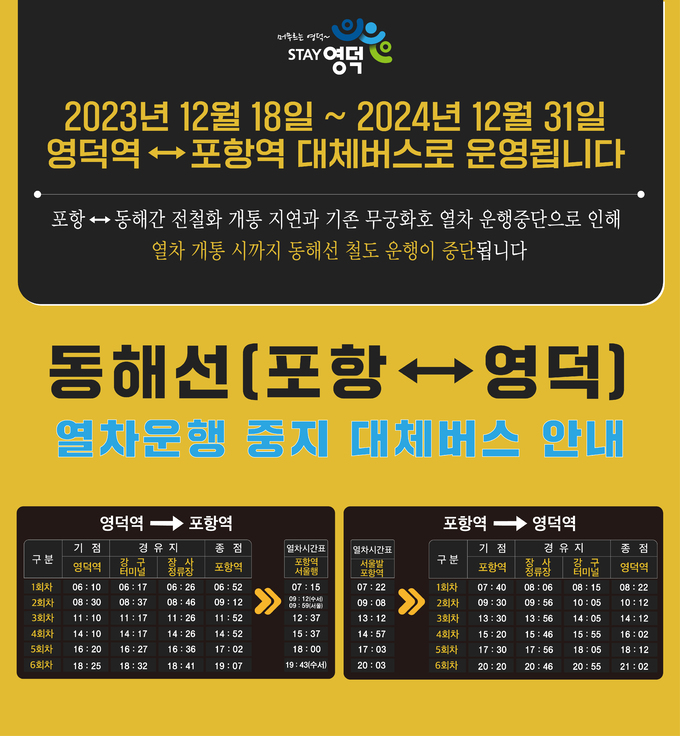 한국철도공사는 영덕~포항 간을 운행 중인 디젤동차(RDC)의 잔존수명평가 결과 안전상 연장 운행이 불가하다는 판단과 함께, 포항~삼척 간 전철화 사업 완료 시기가 올해 12월에서 내년 12월로 연기되면서 영덕~포항 간 열차 운행을 올 12월 18일부터 내년 12월 말까지 중단키로 했다.