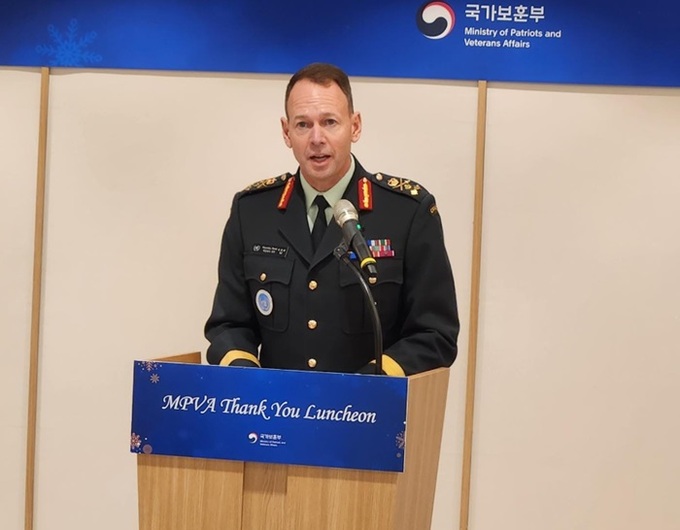 유엔군사령부 데릭 매콜리 신임 부사령관이 20일 서울 용산 로얄파크컨벤션에서 열린 ‘주한 외교사절 초청 감사 오찬’ 행사에 참석해 발언하고 있다. 유엔사 사회관계망서비스(SNS) 캡처
