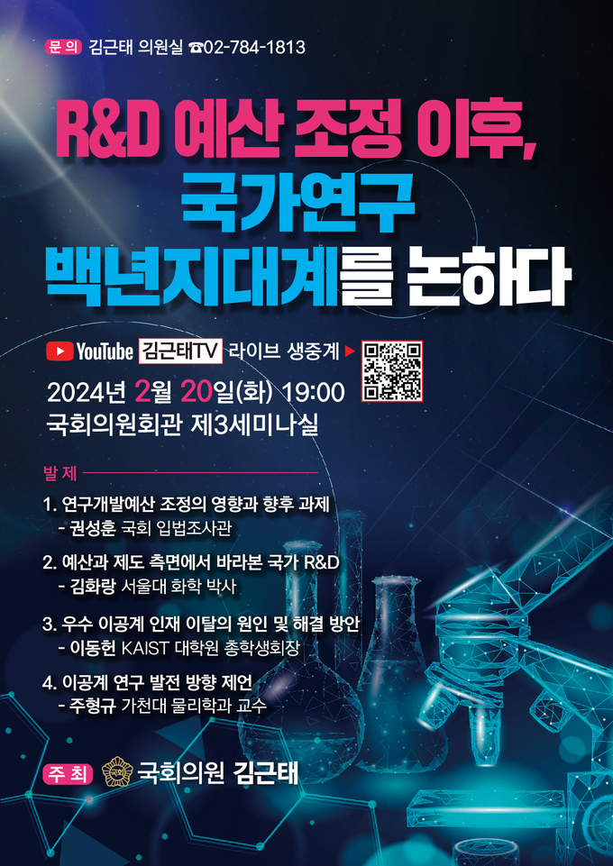 국민의힘 김근태 의원은 오는 20일 오후 7시, 국회 의원회관 제3세미나실에서 ‘R&D 예산 조정 이후, 국가연구 백년지대계를 논하다’ 토론회를 개최한다고 17일 밝혔다.