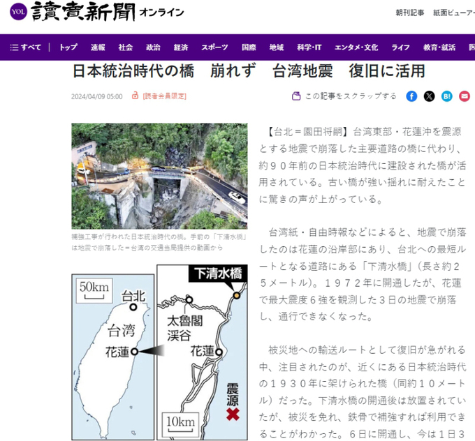 요미우리신문은 9일 ‘일본 통치시대의 다리 무너지지 않아’라는 제목의 기사에서 “지진으로 무너진 주요도로의 다리를 대신해 약 90년전 일본 통치시대에 건설된 다리가 활용되고 있다”며 “오래된 다리가 강한 흔들림을 견딘 것에 놀랍다는 목소리가 높아지고 있다”고 보도했다.