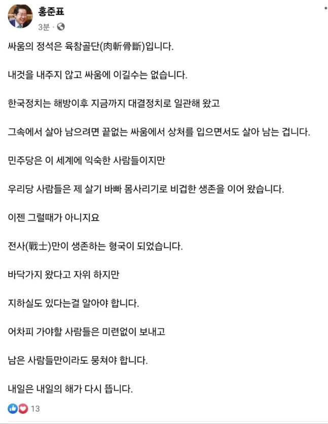 홍 시장은 "바닥까지 왔다고 자위하지만 지하실도 있다는 걸 알아야 한다"면서 이같이 말했다. 아울러 "싸움의 정석은 육참골단(肉斬骨斷)이다"면서 "내것을 내주지 않고 싸움에 이길 수는 없다"고 했다.