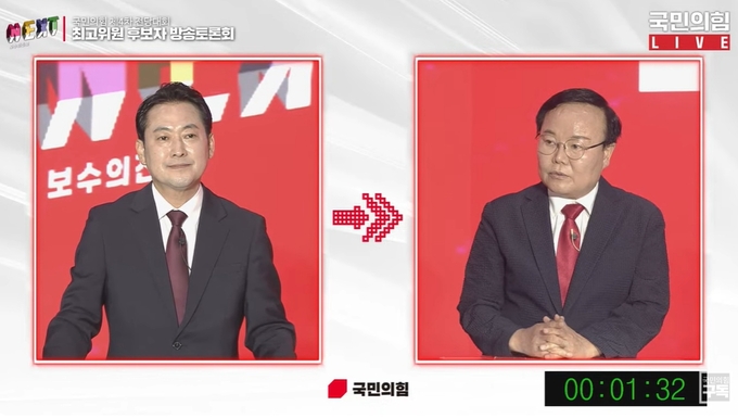 이쯤에서 김 후보의 발언이 길어지고 애초 질문한 의도와 다른 답변이 왔다고 생각됐는지 장 후보는 ‘의원님, 의원님’이라며 김 후보를 거듭 불렀지만, 장 후보의 부르는 말에도 김 후보는 말을 멈추지 않았다.