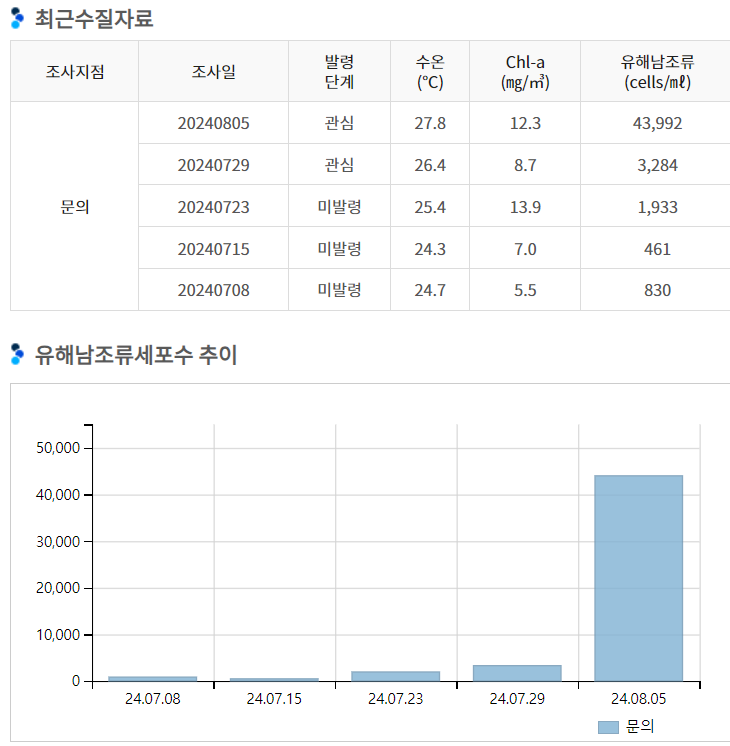 시에 따르면 지난달 금강유역환경청에서 실시한 대청호 문의수역 수질조사 결과 유해 남조류 세포 수가 조류 경보 발령 기준인 1㎖당 1000세포를 2회 연속 초과해 지난 1일 조류경보 ‘관심’ 단계를 발령했다.