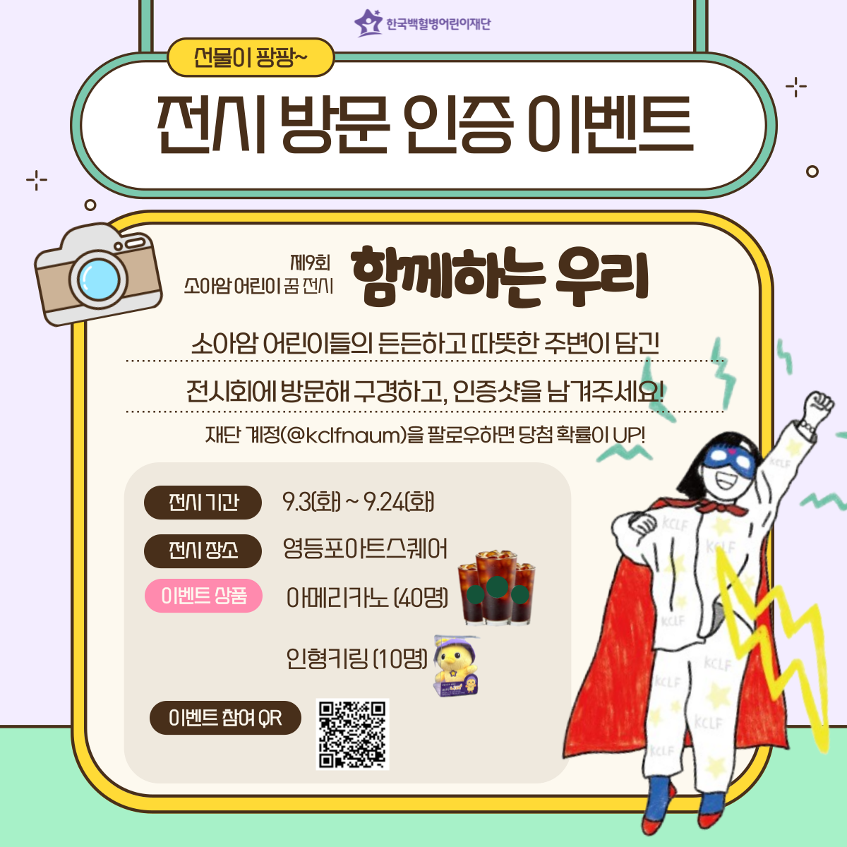 영등포아트스퀘어에 전시된 이번 전시회에서는 53개의 공모전 입상작을 감상할 수 있으며, 소아암 어린이의 주변에서 따뜻하고 든든하게 함께하는 우리의 모습을 그림과 사진, 글로 만날 수 있다. 이외에 소아암 인식개선 캠페인, 방문 인증 이벤트, 응원 메세지 남기기도 진행된다.