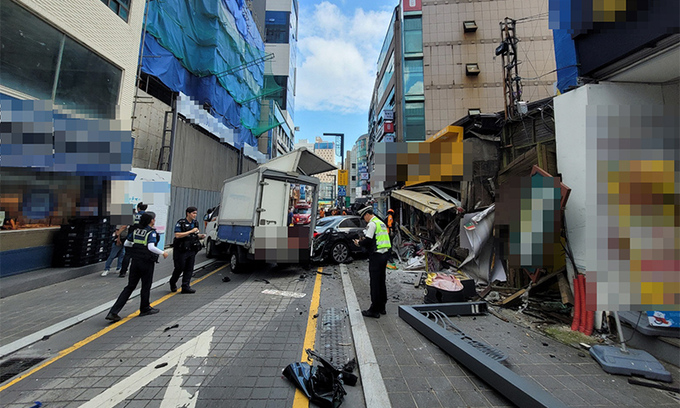 12일 부산 해운대경찰서에 따르면 이날 오후 1시13분쯤 부산 해운대구 해운대구청어귀삼거리 일방통행 도로에서 A씨가 운전하던 벤츠 차량이 정차 중이던 1t 트럭과 보행자 2명을 들이받고, 상가로 돌진했다.