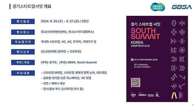 강성천 경과원장은 “아시아 최초로 남유럽 최대 스타트업 플랫폼(사우스 서밋)과 협업해 추진하는 행사로 국내 AI·딥테크 스타트업을 발굴해 글로벌 시장 진출과 투자유치 기회를 제공하는 자리가 될 것”이라고 말했다.