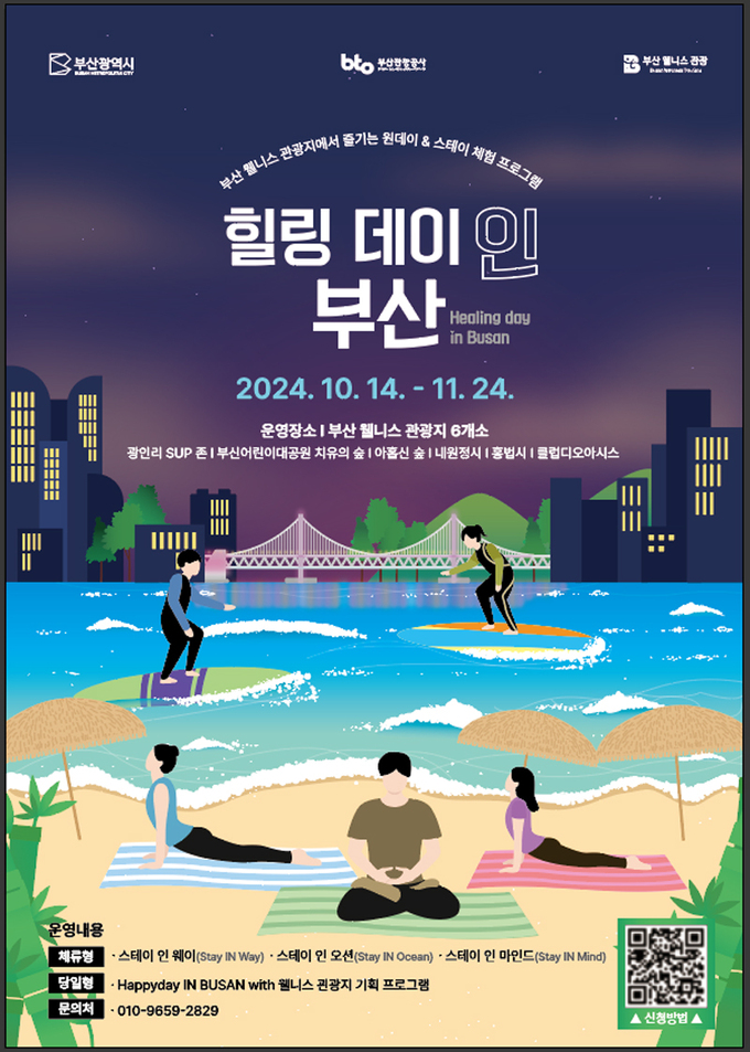 부산시에 따르면 시와 부산관광공사는 15일부터 한 달간 웰니스 관광프로그램 ‘힐링데이 인 부산’(포스터)을 운영한다. 힐링데이 인 부산은 부산지역 웰니스 관광지를 배경으로 체류형 및 당일형 프로그램으로 운영된다. 체류형 프로그램은 도심, 해양, 템플 3가지 주제의 스테이로 진행된다.