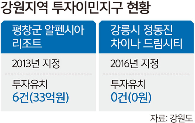 일각에서는 우려의 목소리도 나온다. 앞서 지정된 강원지역 투자이민지구의 외국인 자본 유치 실적이 신통치 않아서다. 2013년 지정된 평창군 알펜시아 리조트 개발 사업은 10년간 6건(33억원) 유치하는 데 그쳤다. 2016년 지정된 강릉시 정동진 차이나 드림시티는 0건이다. 강릉시 차이나 드림시티는 올해 말 지구 지정이 폐지된다.