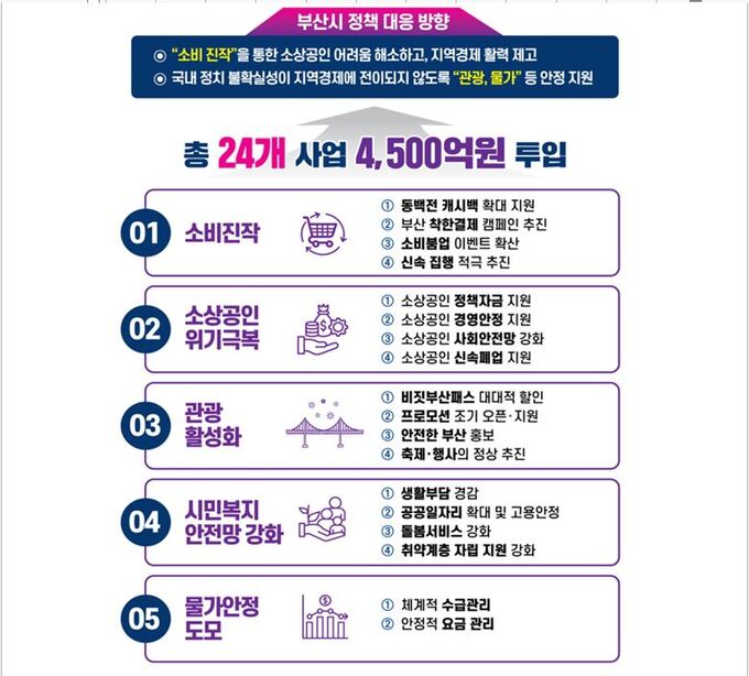 부산시가 추진하는 ‘긴급 민생안정 5대 프로젝트’는 △소비 진작을 통한 지역경제 활력 도모 △소상공인 경영 안정 강화 △할인 프로모션 통한 관광활성화 △시민복지 안전망 강화 △물가안정 도모다.