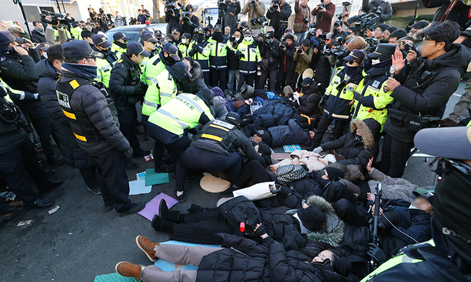 ‘윤 대통령 관저’ 길 막은 보수단체 회원들 강제해산 돌입