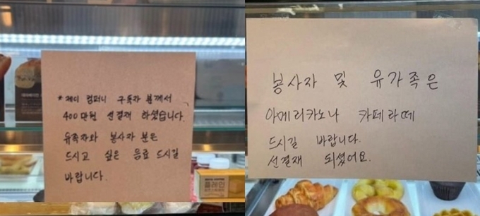 첫 번째 안내문에는 “제이컴퍼니 구독자분께서 400만 원 선결제하셨다. 유족과 봉사자분은 드시고 싶은 음료 드시길 바란다”라고 적혔다. 두 번째 안내문에는 “봉사자 및 유가족은 아메리카노나 카페라테 드시길 바란다. 선결제됐다”고 써 있다.