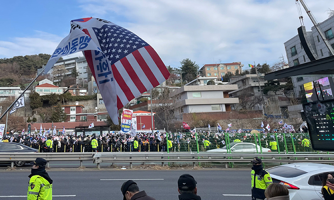 영하권의 추위 속에 이른 아침부터 관저 주변에 운집한 수백 명의 지지자들은 “불법 경찰”, “계엄합법 탄핵무효”를 외치며 공수처의 영장 집행을 저지했다. 이날 오후 2시 현재 체포된 인원은 없다.