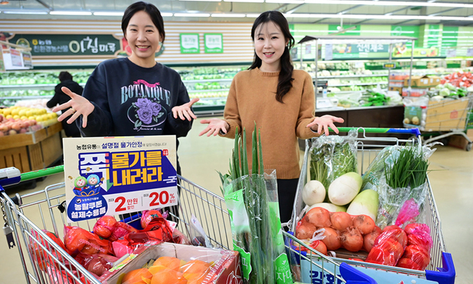 22일 서울 서초구 하나로마트 양재점에서 모델들이 물가 안정을 위한 정부 지원 농축산물 할인지원 행사를 소개하고 있다. 농협유통은 설 성수기 정부 할인지원을 받아 23일부터 30일까지 양재·창동·청주 하나로마트 등에서 무·배추·밤·사과·대추·흙쪽파·양파·단감 등 제수용품 주요 품목을 할인 판매한다.