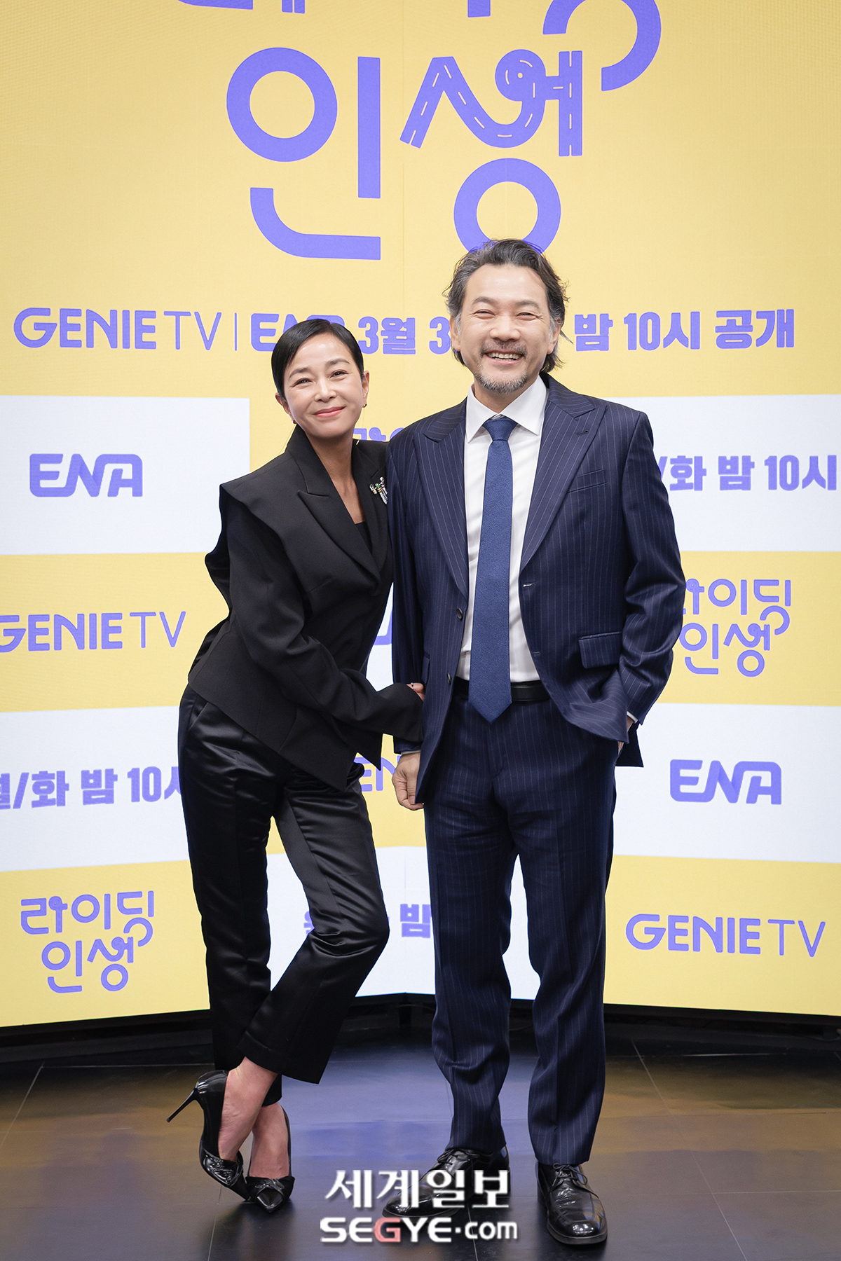 배우 조민수(사진 왼쪽)와 정진영이 25일 오후 온라인으로 진행된 지니 TV 오리지널 드라마 '라이딩 인생' 제작발표회에 참석해 포즈를 취하고 있다.
