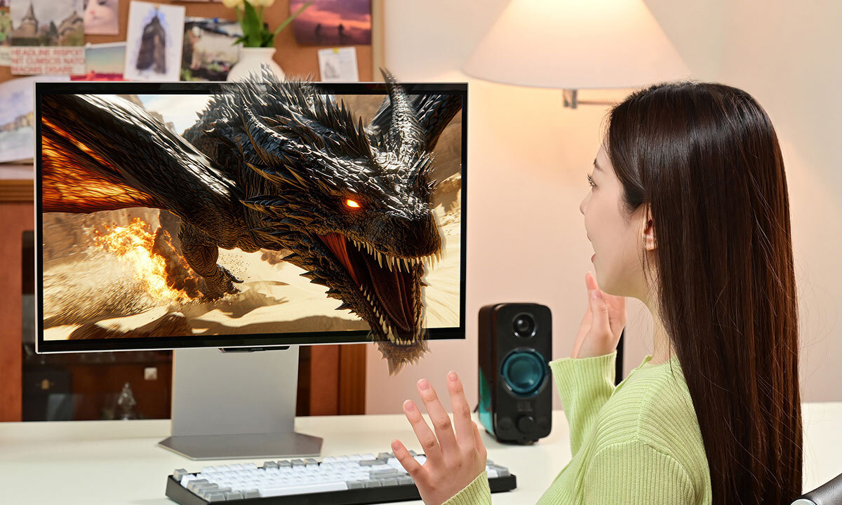 24일 삼성전자 모델이 2025년형 게이밍·고해상도 모니터 신제품 ‘오디세이 3D(3차원)’에서 게임 케릭터가 3차원 이미지로 표출되는 모습에 놀라는 장면을 연출하고 있다. ‘오디세이 3D’는 ‘AI(인공지능) 3D 영상 변환’ 기능을 통해 2차원(2D) 영상을 입체인 3D 콘텐츠로 전환해준다. 사용자는 3D 안경을 쓰지 않아도 3차원 영상을 시청할 수 있다.