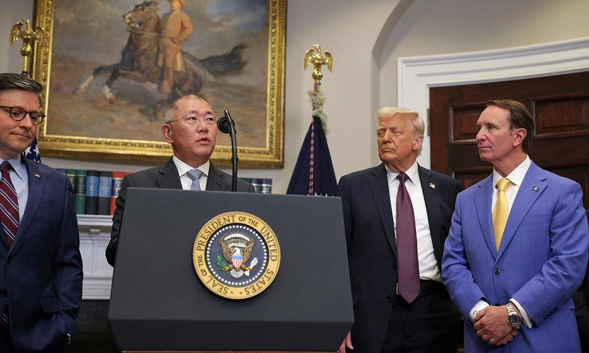 정의선 현대차그룹 회장이 미국 백악관에서 도널드 트럼프 대통령과 함께 현대차가 2028년까지 미국에 총액 210억달러(약 31조원) 규모의 투자를 집행할 것이라고 밝혔다. 트럼프 대통령은 현대를 “대단한 기업”이라고 치켜세우며 현대차의 투자를 자신의 ‘관세 드라이브’ 결과로 홍보했다.