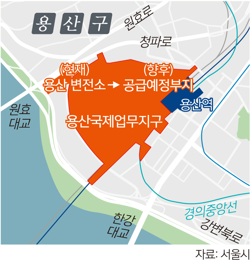 27일 서울시에 따르면 용산국제업무지구에는 최고 100층 랜드마크를 비롯해 대규모 업무시설 도입이 예정됨에 따라 2031년 이후 현재 운영 중인 154kV 규모의 특고압 변전소 1개소 외 동일급 변전소 1개소에 대한 추가 신설이 필요하다. 이를 위해 제1호 필지를 한전에 공급, 특고압 변전소 2개소를 지하에 이·신설하고 지상은 업무시설 등을 도입·개발한다는 것이다.