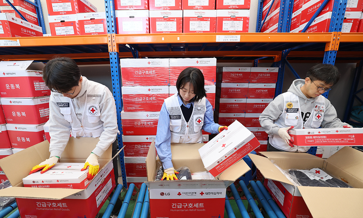 대한적십자사 직원들이 31일 서울 양천구 신월동 재난안전센터에서 산불 이재민 대피소 생활환경 개선을 위한 긴급구호세트를 포장하고 있다. 적십자사는 영남권 대형 산불 피해를 입은 이재민 지원을 위해 담요, 운동복, 일용품 등이 담긴 긴급구호세트와 햇반, 즉석죽, 통조림, 장조림, 볶음김치, 즉석 짜장, 프레스 햄, 간편미역국 등으로 구성된 비상식량세트를 전달하고 있다.