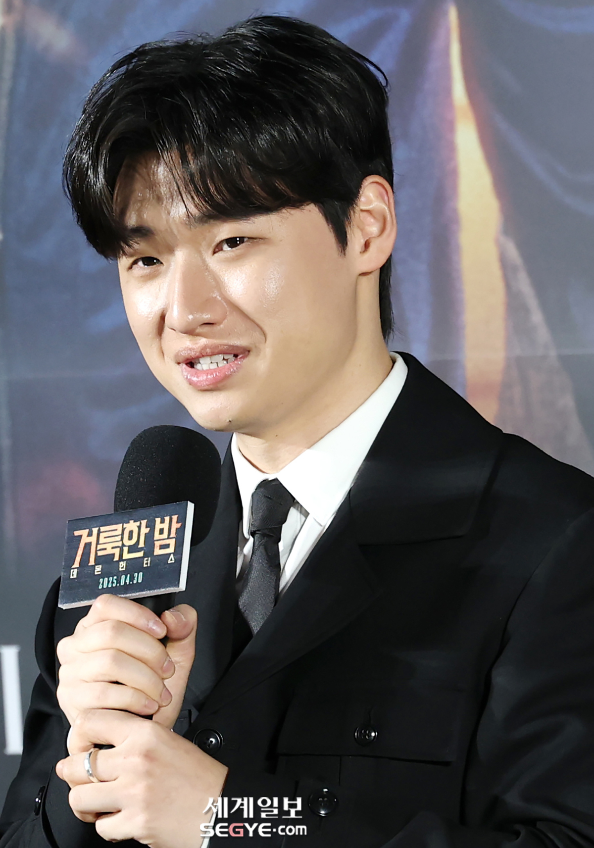 배우 이다윗이 2일 서울 광진구 롯데시네마 건대입구에서 열린 영화 '거룩한 밤: 데몬 헌터스’(감독 임대희) 제작보고회에 참석해 인사말을 하고 있다.
