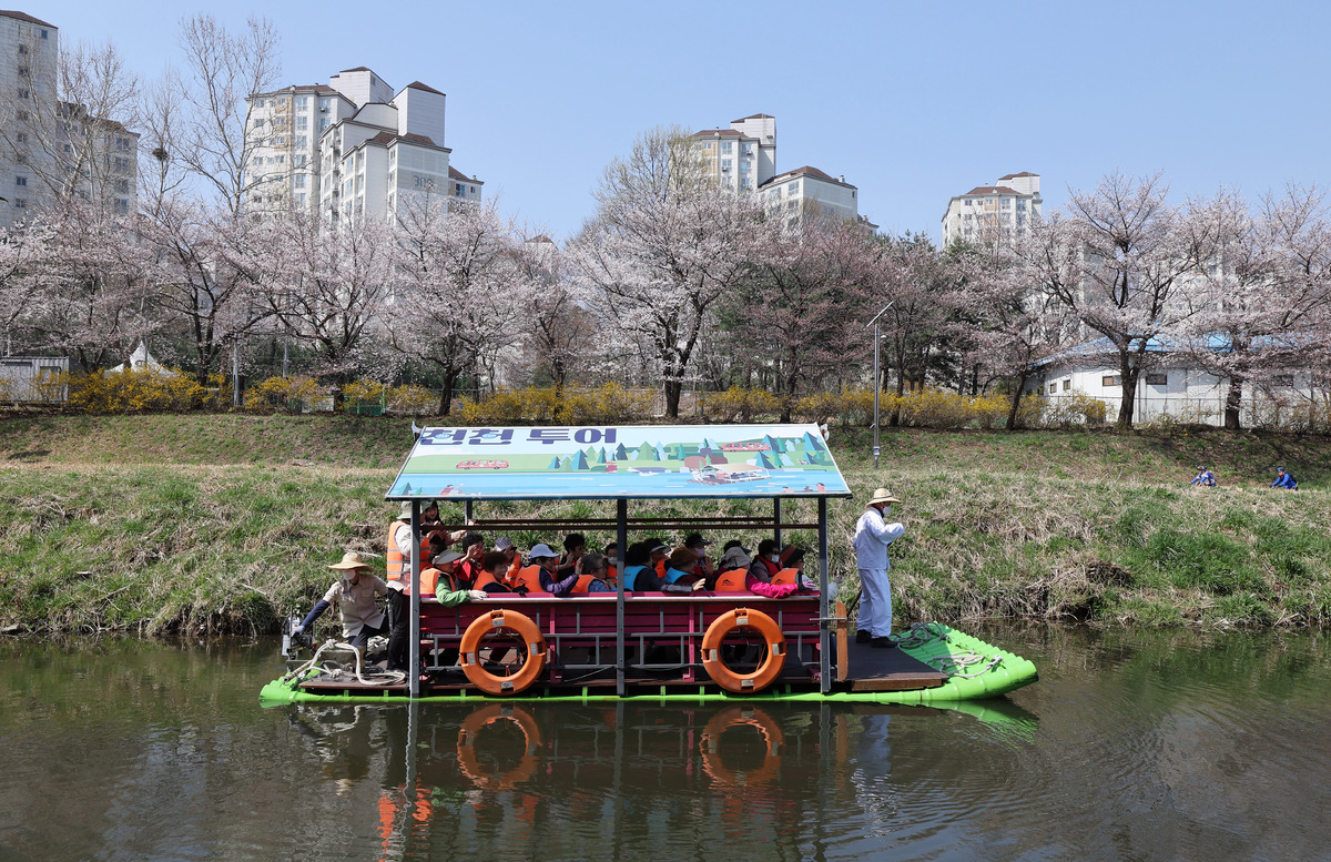 7일 서울 서초구 양재천에서 '어르신 하루여행'에 참여한 어르신들이 도심 속 이색 뗏목 체험을 하고 있다.