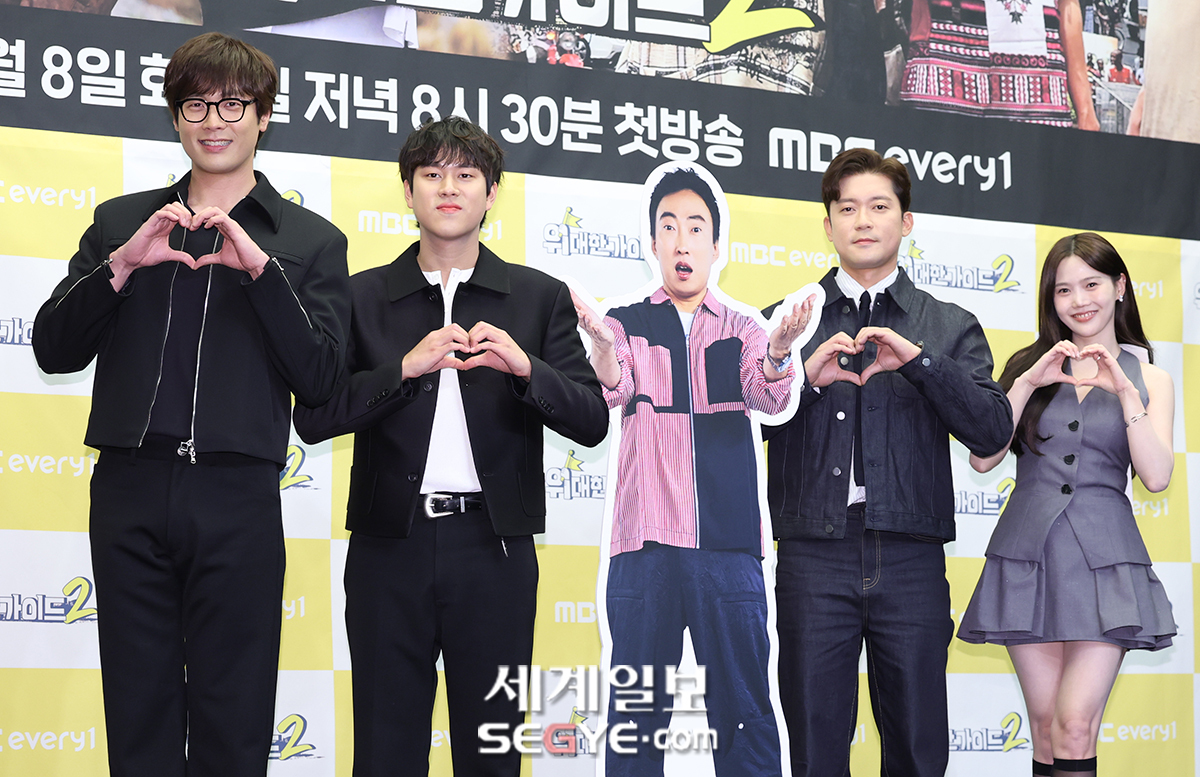 배우 최다니엘, 가수 이무진, 방송인 김대호, 가수 오마이걸 효정(사진 왼쪽부터)이 8일 오후 서울 마포구 스탠포드호텔에서 열린 MBC에브리원 ‘위대한 가이드2’의 제작발표회에 참석해 포즈를 취하고 있다.