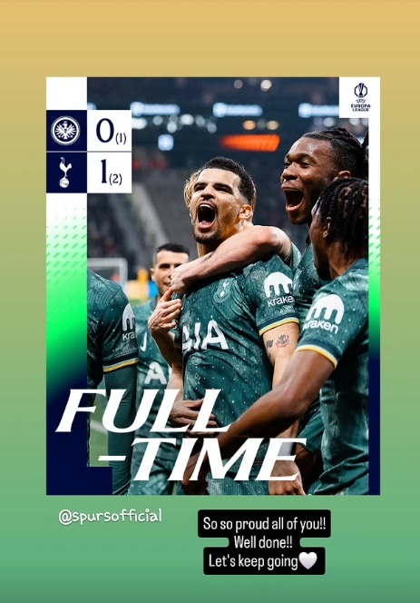 하지만 토트넘이 승리하면서 손흥민은 부담을 덜게 됐다. 손흥민은 경기 후 SNS에 토트넘 선수들이 골 세리머니 하는 사진과 함께 ‘너희 모두가 너무 자랑스럽다. 정말 잘했다. 우리 계속 나아가자’는 글을 올렸다.
