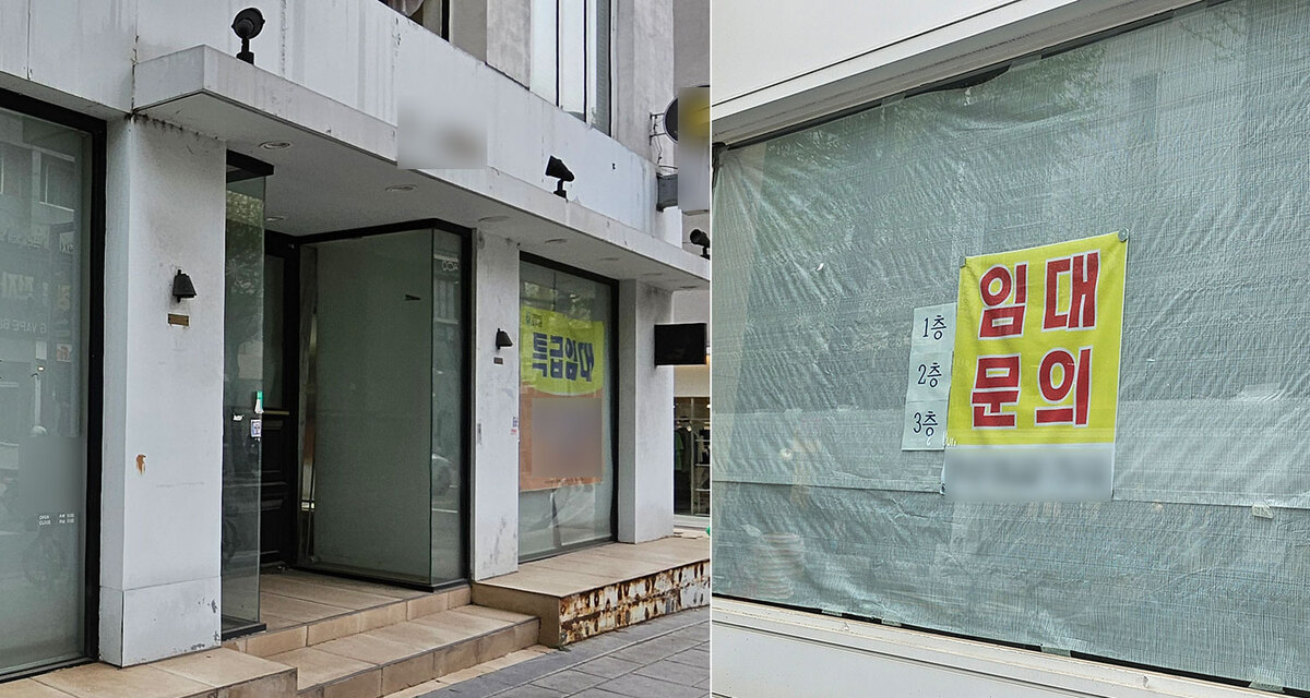 몇 년 전만 해도 손님들로 북적였던 거리 초입 카페 건물 전체가 비워져 방치되고 있었다. 먼지만 쌓인 유리창엔 ‘임대 문의’ ‘전층 임대’ 스티커만 남았다. 그 옆으로도 건물 절반은 공실이었다. 철거할 때 떼어낸 간판 흔적만 이곳이 의류숍이었다는 것을 알 수 있게 했다.