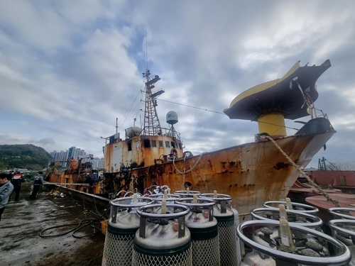 소방 당국은 선박 해체 작업 중 절단기 불꽃이 튀어 화재가 발생한 것으로 보고 자세한 원인을 조사하고 있다.