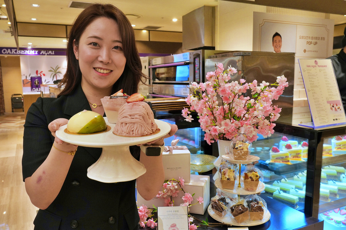 서울 중구 롯데백화점 본점 지하 1층 식품관에 마련된 일본 유명 파티시에 요로이즈카 도시히코의 디저트 팝업스토어에서 모델이 디저트 상품을 소개하고 있다. 이번 팝업스토어에서는 ‘사쿠라 몽블랑’, ‘쿠프 사쿠라’, ‘라따뚜이 크로크무슈’ 등 지난해 팝업보다 더 다양해진 디저트를 선보인다고 백화점 측은 20일 밝혔다.