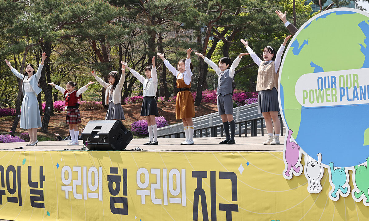 지구의 날을 이틀 앞둔 20일 서울 여의도공원에서 열린 ‘2025 지구의 날 기념행사’에서 어린이들이 ‘지구를 위한 도레미송’을 선보이고 있다. ‘지구의 날’은 해마다 세계 192개국 10억명이 참여하는 세계적인 환경기념일로, 올해 세계 공통 주제는 ‘우리의 힘, 우리의 지구’이다.