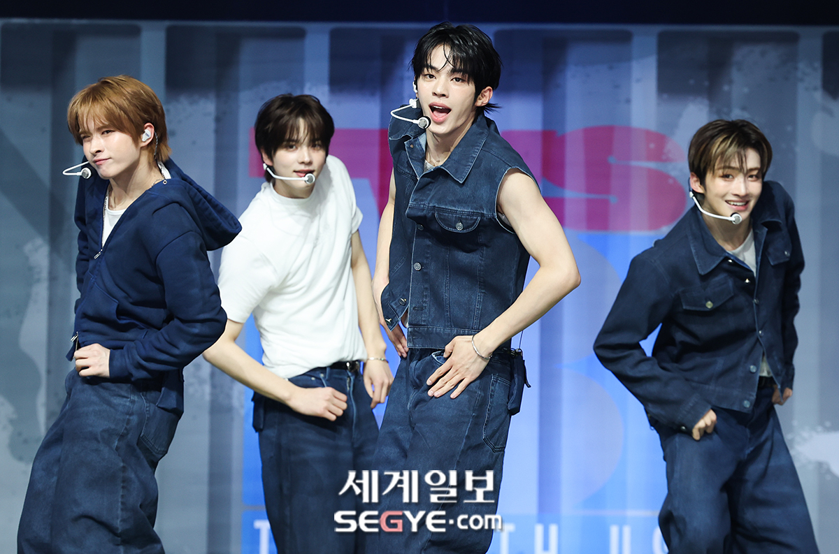그룹 투어스가 21일 서울 용산구 한남동 블루스퀘어에서 열린 미니 3집 '트라이 위드 어스'의 쇼케이스에 참석해 포즈를 취하고 있다.