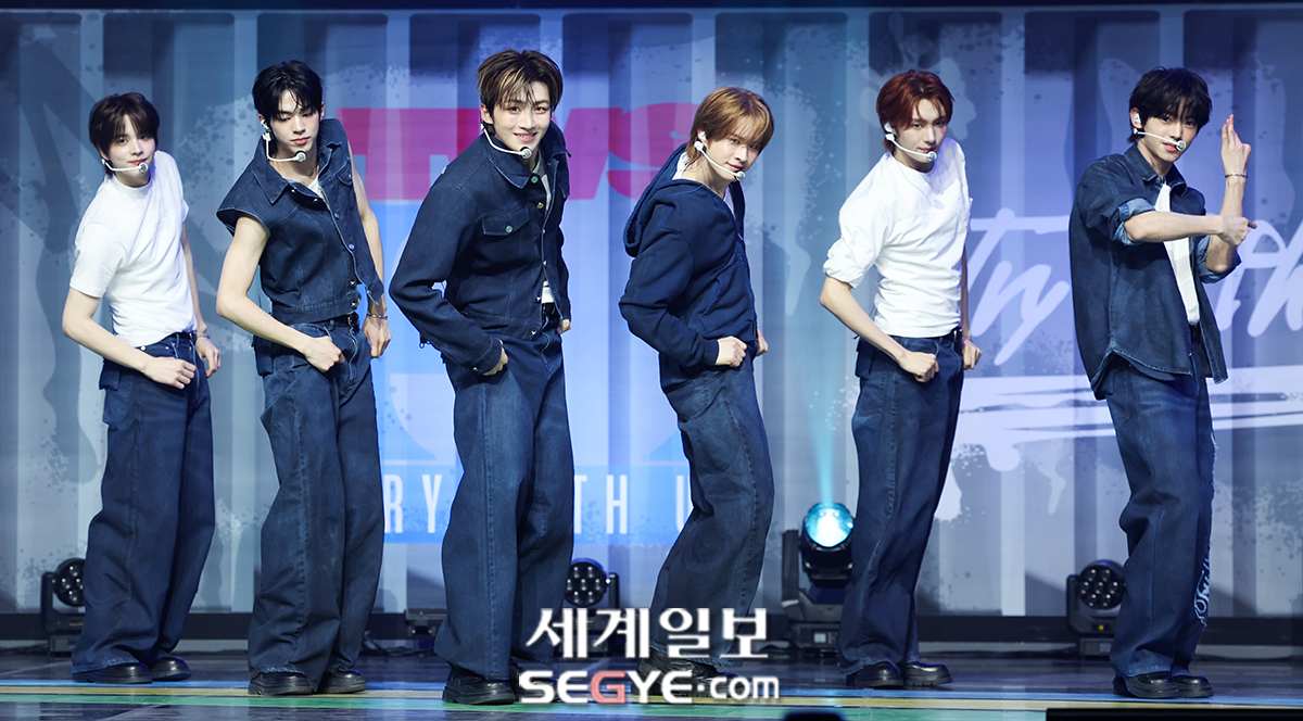 그룹 투어스가 21일 서울 용산구 한남동 블루스퀘어에서 열린 미니 3집 '트라이 위드 어스'의 쇼케이스에 참석해 열띤 공연을 펼치고 있다.