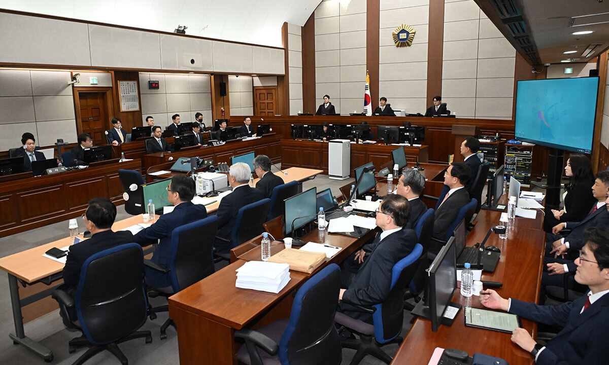 21일 오전 서울 서초구 서울법원종합청사 417호 대법정에서 서울중앙지법 형사25부 심리로 윤석열 전 대통령(원안)의 내란 우두머리 혐의 사건에 대한 2차 공판이 열리고 있다. 윤 전 대통령이 법정에 출석한 모습은 이날 처음으로 언론에 공개됐다.