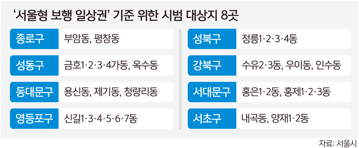 22일 서울시에 따르면 시는 지난 9일 보행 일상권 조성 계획 기준을 마련하기 위한 대상지 8곳을 선정했다. 보행 일상권은 오세훈 서울시장이 2022년 ‘2040 서울도시기본계획’을 발표하면서 처음 제시한 도시 공간 개념으로, 멀리 가지 않고도 주거지를 중심으로 다양한 생활을 할 수 있는 자족적 생활권을 뜻한다. 일반인의 보행 속도와 실제 보행 거리, 자전거나 개인형 이동 장치(PM) 같은 이동 수단을 감안해 시간적 범위는 도보 30분 내, 공간적 범위는 최대 1.8㎞ 이내로 설정됐다.