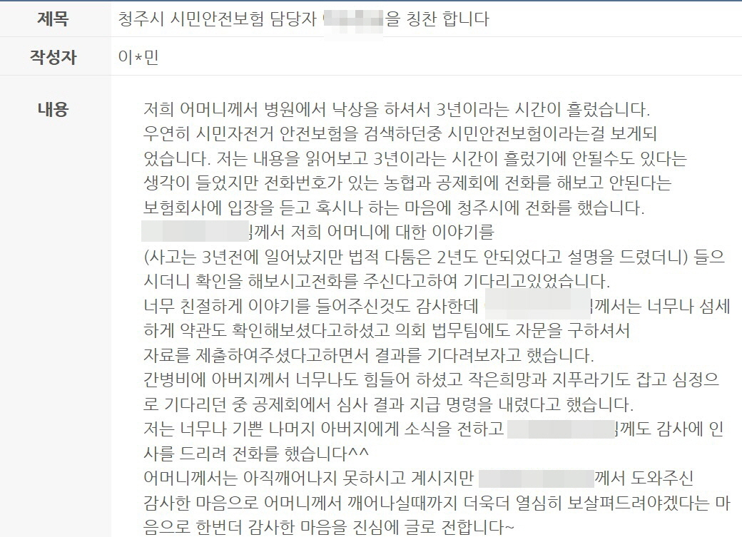 시민안전보험의 가장 큰 특징은 개인보험이나 산재보험 등과 중복해서 받을 수 있다는 점이다. 또 예기치 않은 사고 등에 긴급 자금으로 활용하는 데 도움을 준다. 실제 지난해 3월19일에는 3년 전 낙상 사고로 깨어나지 못하는 어머니의 간병비에 시민안전보험이 도움 됐다는 내용의 글이 올라오기도 했다.