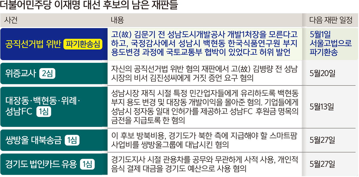 대법원이 1일 더불어민주당 이재명 대선 후보의 공직선거법 위반 사건을 유죄 취지로 파기환송하면서 이 후보를 둘러싼 사건들 재판의 향배에도 관심이 모인다. 법조계에 따르면 이 후보가 기소돼 재판 절차가 진행 중인 사건은 선거법 위반 건 외에도 4건이 더 있다.