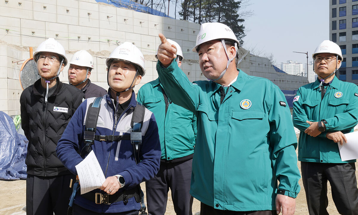 이범석 충북 청주시장이 아파트 건설현장에서 관계자들과 안전점검을 하고 있다. 청주시 제공