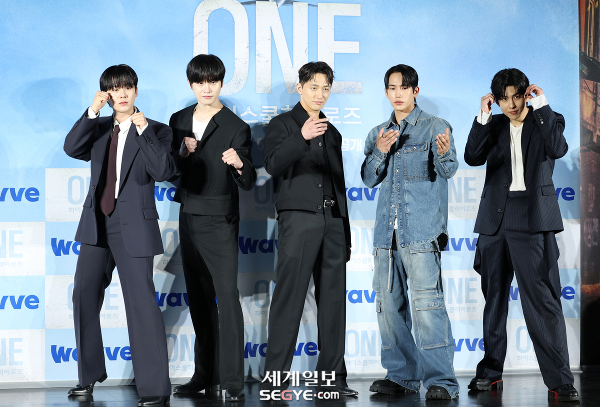 배우 이정하, 김도완, 유희제, 육준서, 임성균(사진 왼쪽부터)이 28일 서울 광진구 건대입구 롯데시네마에서 열린 새 드라마 'ONE : 하이스쿨 히어로즈' 제작발표회에 참석해 포즈를 취하고 있다.
