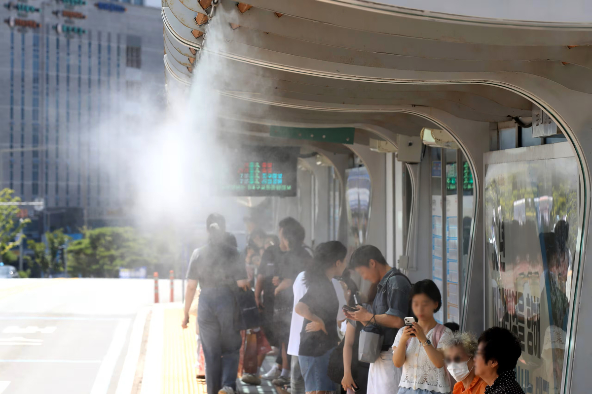 대구 동구 동대구역 앞 버스정류장에 쿨링포그(인공 물안개)를 가동해 더위를 식혀주고 있다. 대구=뉴스1