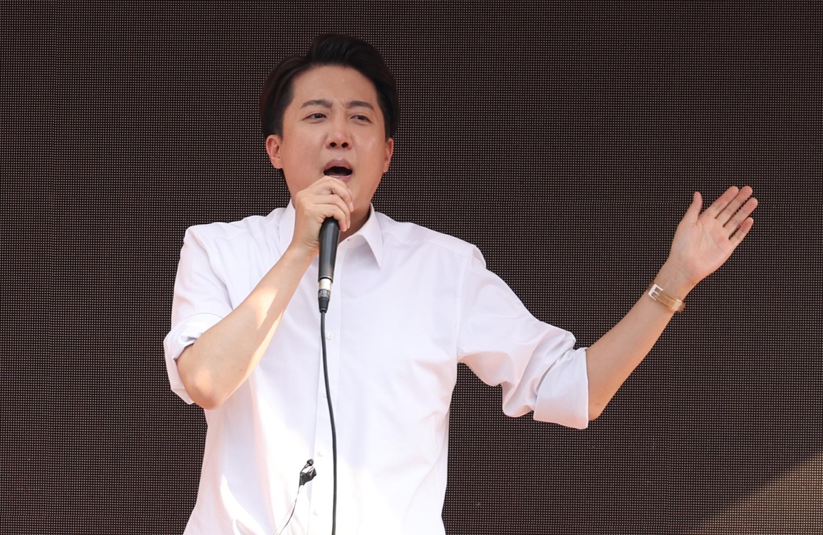 이준석 개혁신당 대선후보가 29일 서울 성북구 고려대 정경대 후문에서 열린 유세에서 지지를 호소하고 있다. 뉴시스