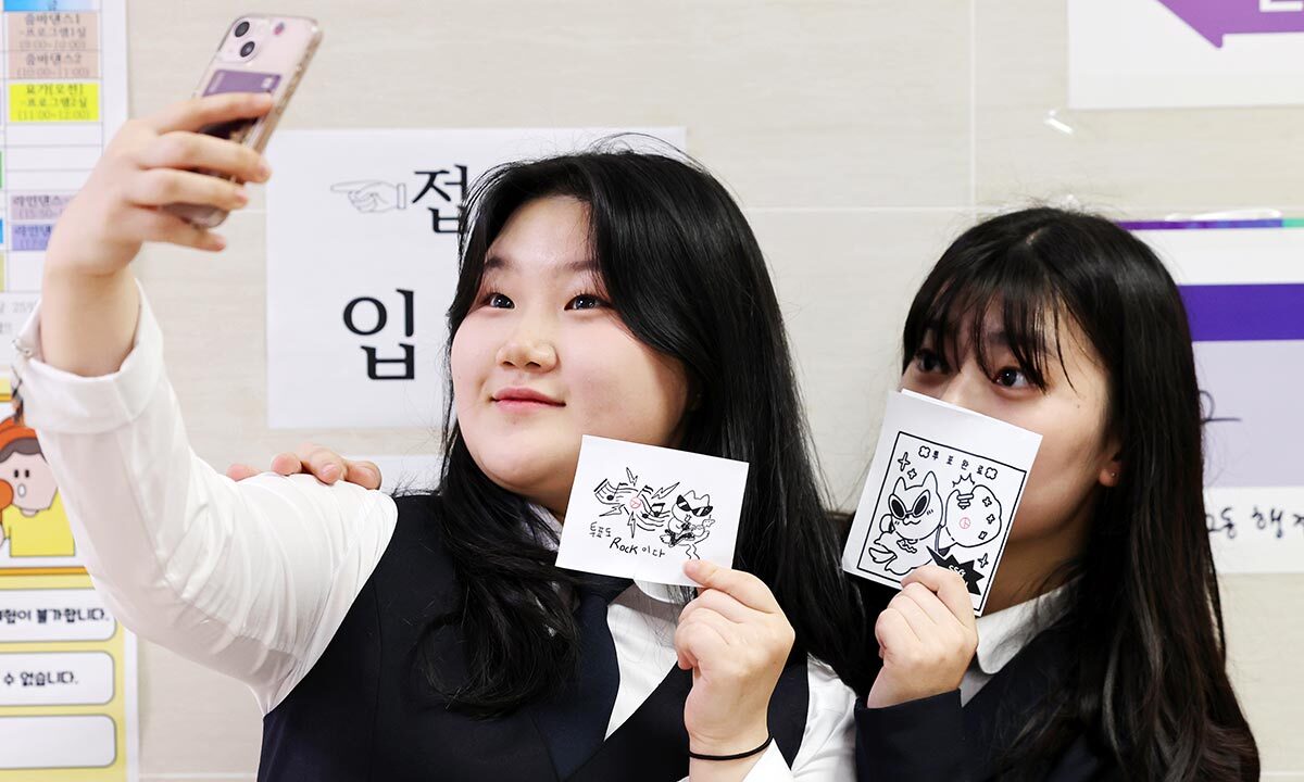 제21대 대통령 선거 사전투표 첫날인 지난달 29일 광주 서구 화정2동 사전투표소에서 지역 고등학교 3학년 학생들이 생애 첫 투표를 마친 뒤 기념 사진을 찍고 있다. 광주=연합뉴스