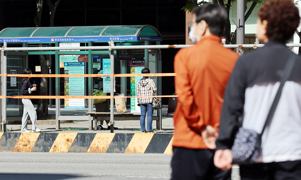 광주 시내버스 노조가 전면 파업에 들어간 5일 광주 서구 치평동 한 버스정류장에서 시민들이 버스를 기다리고 있다. 연합뉴스