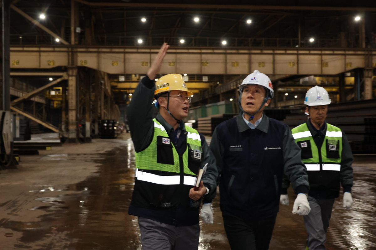 지난해 12월 철강 위기 극복을 위해 동국제강 현장을 방문한 이강덕(가운데) 포항시장. 포항시 제공