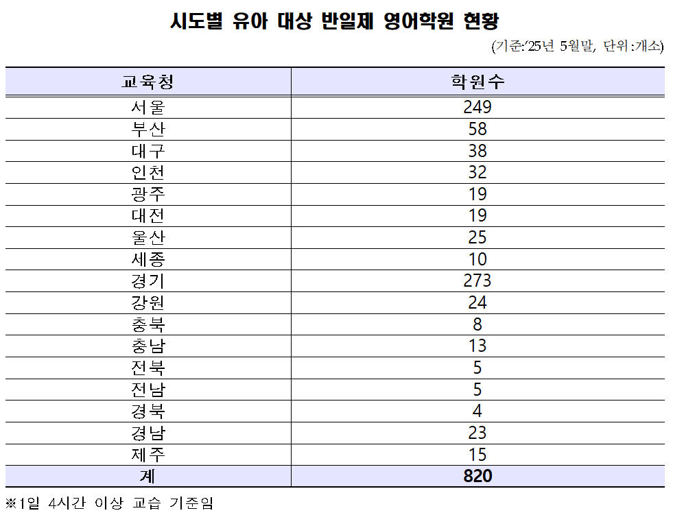 교육부에 따르면 유아 대상 반일제 영어학원은 ▲2019년 615곳 ▲2020년 724곳 ▲2021년 718곳 ▲2022년 811곳 ▲2023년 842곳이었다. 지난해 6월 기준으로는 831곳으로 2023년에 비해 소폭 줄었고, 올해 5월 기준으로도 1년 만에 11곳이 줄었다.