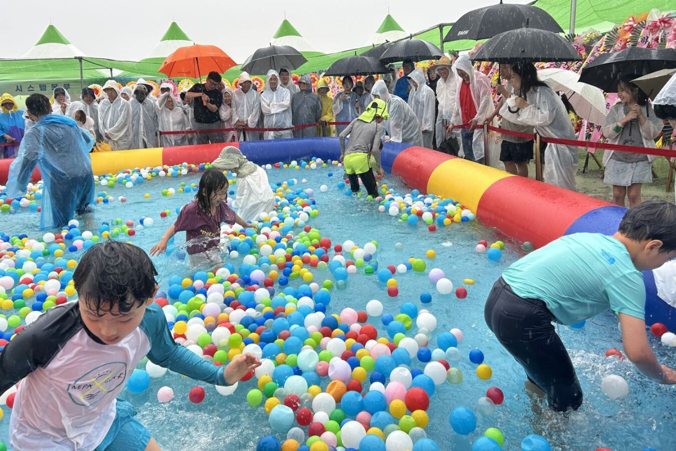 올해 축제는 15일까지 사흘간 심원면 만돌어촌체험마을 만돌갯벌체험학습장 일원에서 열린다. 이날 비가 내리면서 오후에 예정된 개막식은 취소됐지만, 준비된 프로그램들은 순조롭게 진행됐다.